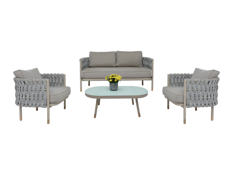 | Specifikation | aluminiumsramme med vævet reb, 4 stk i alt; loveseat: L73*B141*H63cm, 1PC enkeltstol: L73*B75*H63cm, 2STK sofabord:L100*B50*H38cm, 5mm hærdet hvidt glas, 1STK |
