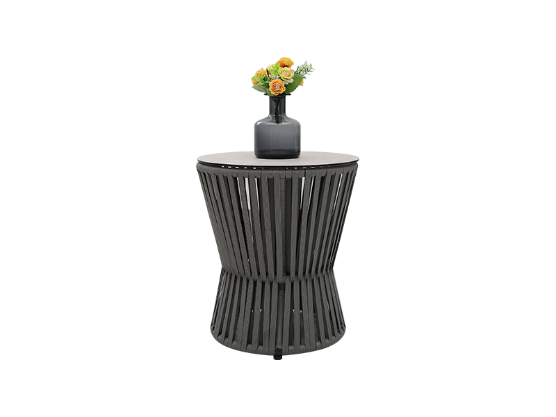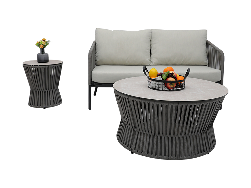 Specifikation | Aluminiumsramme med fladt reb vævet, 10 cm sædehude med svamp inde, rygpude med fiberfyldning inde, 230 g/m2 polyester pude stof; enkelt stol: L82*W75*H69cm, 2pcs; Loveseat -stol: L82*W142*H69CM, 1 stk; Sofabord: ∮85*H43cm, 6 mm glas baseret på keramik; Sidebord: ∮42*H48CM, 6 mm glas baseret på keramik |